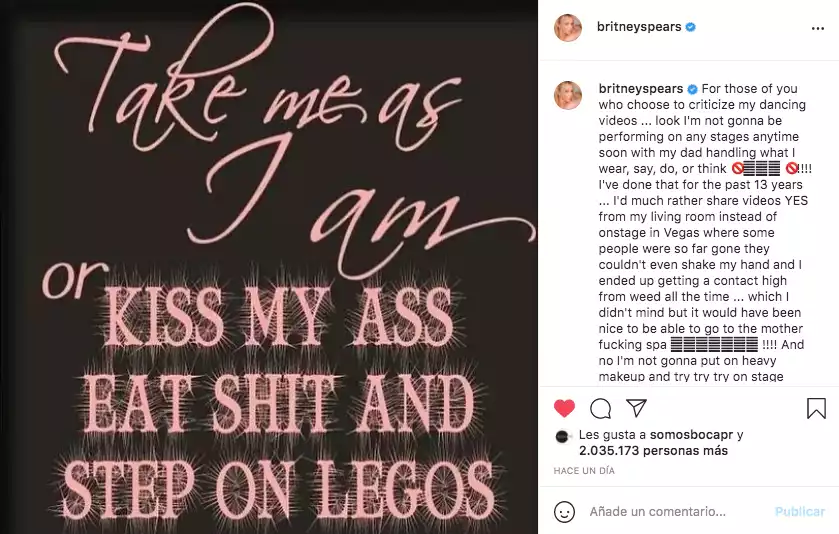 Con una placa negra con la leyenda "Tómenme como soy o bésenme el c..., coman mier.. y pisen legos" le dedicó especiales palabras a su hermana. "Renuncio. No quiero que mi hermana haga performance de mis canciones convertidas en remixes en entregas de premios. Mi tan llamado 'sostén' me hirió profundamente. Esta tutela me quitó los sueños", compartió en su durísimo mensaje.
