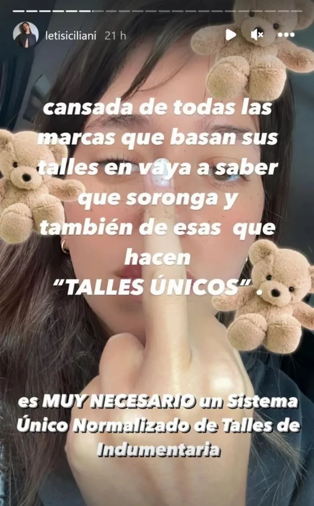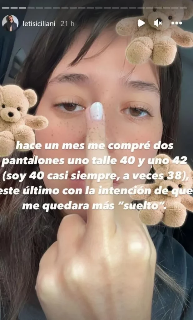 Esta ley, que le preocupa a muchas personas, inspiró el enojo de la actriz. A través de sus historias compartió con lujo de detalle su experiencia personal: “Hace un mes compré dos pantalones, uno talle 40 y uno, 42 (soy 40 casi siempre, a veces 38). Este último con la intención de que me quedara más ‘suelto’”, empezó diciendo Leticia.