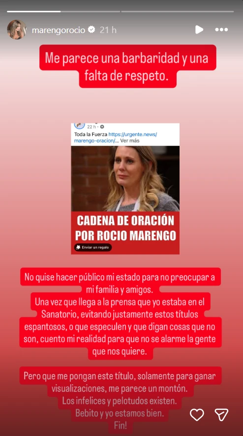 “Me parece una barbaridad y una falta de respeto”, escribió Marengo en una historia de Instagram que publicó este domingo mostrando la captura del portal que hizo estallar su enojo. Según detalló, su intención inicial había sido transitar esos días con bajo perfil, pero la filtración de su presencia en el sanatorio abrió la puerta a especulaciones que la obligaron a hablar.