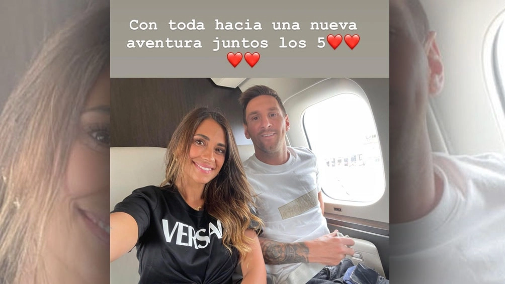Mientras viajaba rumbo a su nuevo hogar, su esposa Antonela Roccuzzo compartió en sus redes sociales una tierna fotografía junto a él en pleno vuelo y le dedicó unas románticas palabras: "Con toda, hacia una nueva aventura juntos los 5″.