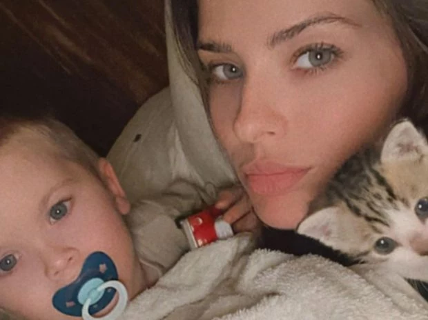 "En casa siempre hay un bebé", cerró la actriz y se mostró e su cama junto a Amancio, su hijo menor, y uno de los gatitos recién nacidos.