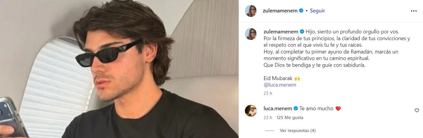 Zulemita Menem eligió sus redes para poner en palabras una escena privada de fe. “Hijo, siento un profundo orgullo por vos… Hoy, al completar tu primer ayuno de Ramadán, marcás un momento significativo en tu camino espiritual. Que Dios te bendiga y te guíe con sabiduría. Eid Mubarak”, escribió, arrobando a Luca Berdoldi Menem. La respuesta fue tan sencilla como contundente: “Te amo mucho”, dejó él, a modo de eco amoroso, debajo del posteo.