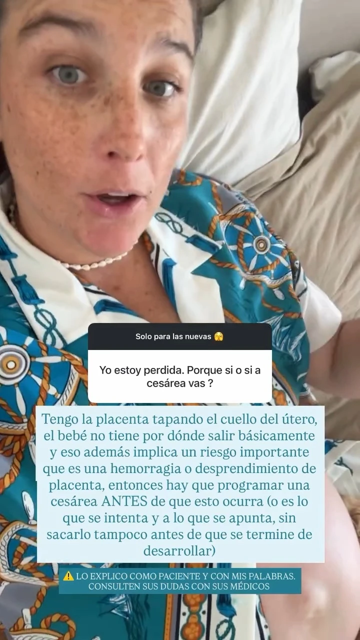 Luego fue al punto clave y lo puso “en criollo”: “Tengo la placenta tapando el cuello del útero, el bebé no tiene por donde salir básicamente y eso además implica un riesgo importante que es una hemorragia o desprendimiento de placenta, entonces hay que programar una cesárea ANTES de que esto ocurra (o es lo que se intenta y a lo que se apunta, sin sacarlo tampoco antes de que se termine de desarrollar). Lo explico como paciente y con mis palabras. Consulten sus dudas con sus médicos”. Su descripción coincide con el diagnóstico de placenta previa, una condición que en la recta final del embarazo suele derivar en cesárea para disminuir riesgos para la madre y el bebé.