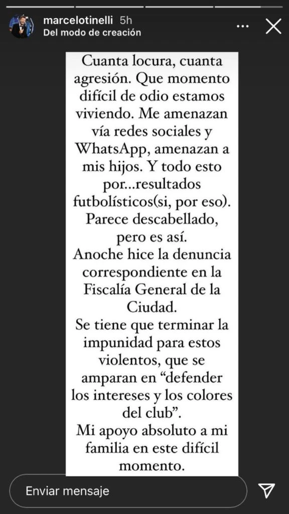 "Parece descabellado, pero es así. Anoche hice la denuncia correspondiente en la Fiscalía General de la Ciudad. Se tiene que terminar la impunidad para estos violentos, que se amparan en 'defender los intereses y los colores del club'. Mi apoyo absoluto a mi familia en este difícil momento”.