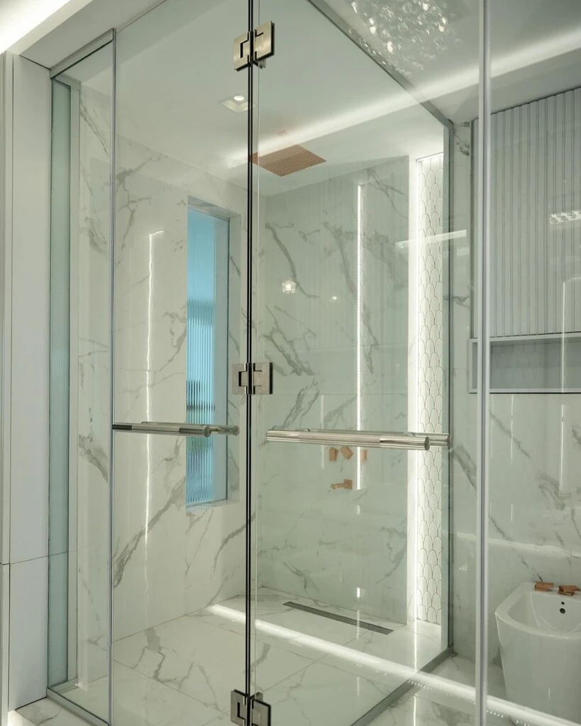 Eligió varios cristales y espejos para dividir el gran espacio, además de poner dos bachas, estantes y muebles que resuelven la dinámica de pareja a la hora de convivir. Cabe destacar que el falso mármol es el protagonista indiscutido también de este ambiente.