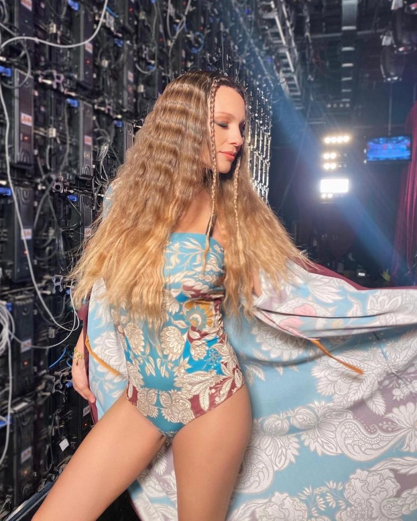 "Habíamos pensado en usar esas botas desde temprano y la decisión de no usar short fue para causar un poco de impacto, ya que el show nos permite este tipo de cosas", agrega su vestuarista.
