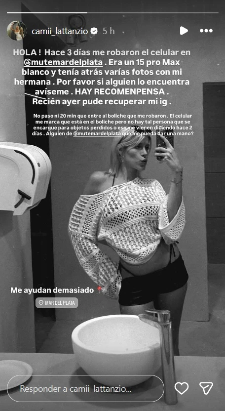En medio de la temporada marplatense, Cami Lattanzio relató en sus historias de Instagram que le robaron el teléfono en un reconocido club de playa, donde se llevan adelante diferentes tipos de shows y fiestas del verano.