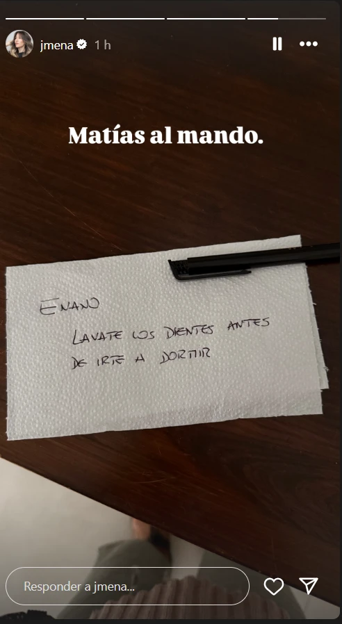 En tanto, en otro posteo que hizo en sus redes, Jime mostró una captura de la tierna nota que su pareja, y papá del bebé que viene en camino, Matías Palleiro, le dejó a su hijo mayor, fruto de su relación con Daniel Osvaldo, para recordarle lo que su madre no podía por estar enferma haciendo reposo en su cama: "Enano lavate los dientes antes de irte a dormir".
