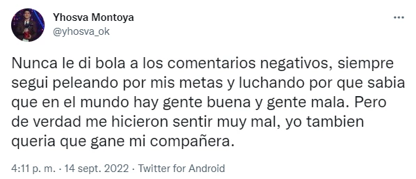 En su cuenta de Twitter descargó: "Nunca le di bola a los comentarios negativos. Siempre seguí peleando por mis metas y luchando por que sabia que en el mundo hay gente buena y gente mala. Pero de verdad me hicieron sentir muy mal, yo también quería que gane mi compañera".
