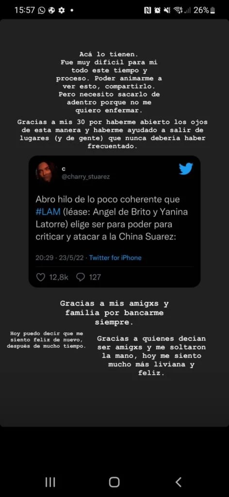 "Gracias a mis amigxs y mi familia por bancarme siempre. Hoy puedo sentir que me siento muy feliz de nuevo después de mucho tiempo", escribió en sus historias de Instagram, y agregó: "Gracias a quienes decían ser amigxs y me soltaron la mano. Hoy me siento más liviana y feliz".