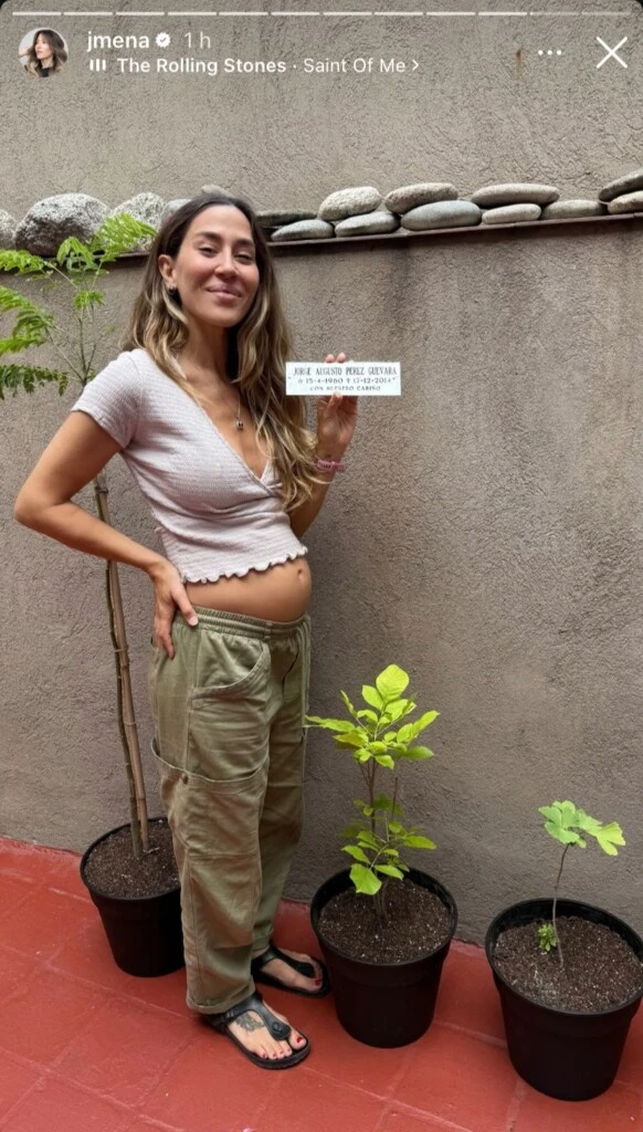 Minutos después Jimena compartió una fotografía junto a una chapa con el nombre de su padre, su fecha de nacimiento y su fecha de muerte. En la imagen se la podía ver mostrando su incipiente pancita de embarazo junto a los árboles que plantó.