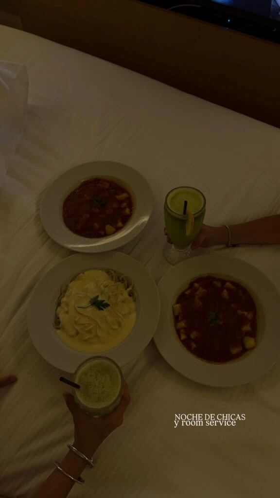 Dentro del hotel, el clima fue igual de cuidado. Mesas largas perfectamente armadas, vajilla elegante, copas alineadas y escenas de room service nocturno, con platos servidos sobre la cama y tragos verdes en mano. En una de las imágenes más comentadas, Wanda dejó ver un momento íntimo de “noche de chicas”, con comida y relax.