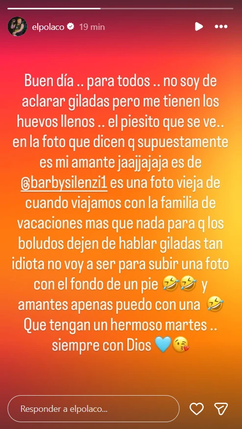 “Buen día para todos... no soy de aclarar giladas pero me tienen los huevos llenos... el piesito que se ve en la foto que dicen que supuestamente es mi amante jaajjajaja es de @barbysilenzi1”, comenzó escribiendo, visiblemente molesto.