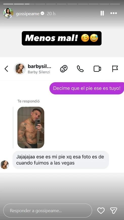 Sin embargo, cuando la polémica recién comenzaba, Barby Silenzi ya había intentado bajar el tono. En diálogo con Pochi, de @gossipeame, aseguró: “Jajaj ese es mi pie porque esa foto es de cuando fuimos a Las Vegas”.