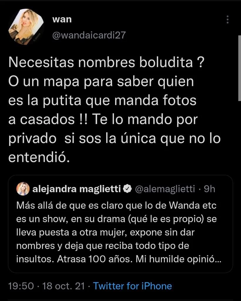 La agresiva respuesta de Wanda fue la siguiente: "Necesitás nombres, boludita? O un mapa para saber quién es la putita que manda fotos a casados!! Te lo mando por privado si sos la única que no lo entendió".