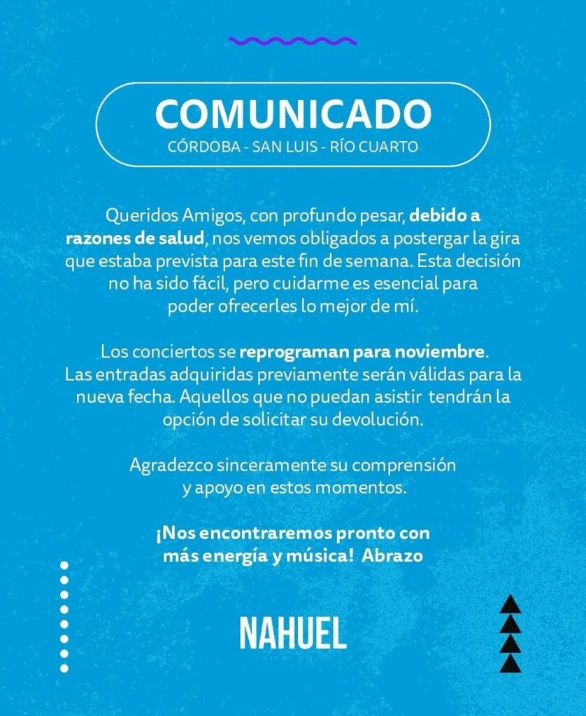 Cada vez que puede, Nahuel Pennisi se reúne con sus fanáticos en diferentes partes del país, donde los deleita con su música y populares melodías. El cantante se preparaba para comenzar una gira por Córdoba, San Luis y Río Cuarto, pero en las últimas horas tuvo que cancelar estas presentaciones.