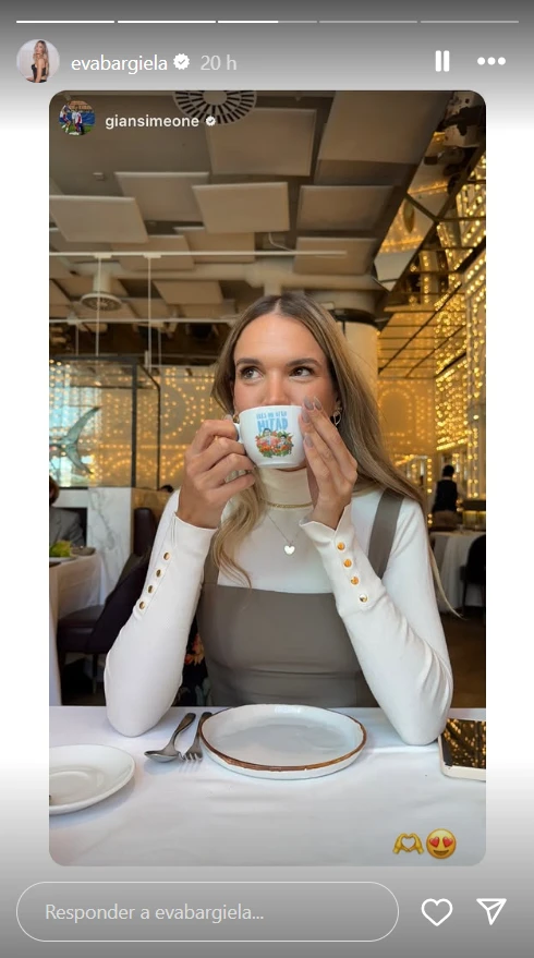 En detalle, el jugador del club Rayo Majadahonda, de la segunda división del fútbol español, subió a sus historias una imagen de Eva sentada en un coqueto restaurante. A esa foto, él le sumó dos emojis: el de unas manos formando un corazón y el de un corazón rojo; dando a entender lo profundamente enamorado que está de la modelo.