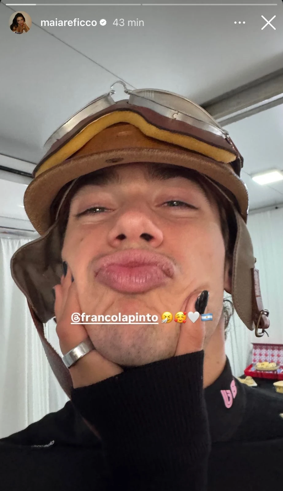 A través de sus historias de Instagram, Maia Reficco compartió una imagen que le tomó al piloto: en la foto se ve su mano sosteniéndole el rostro mientras él le lanza un beso a cámara. La actriz lo arrobó y sumó emojis de amor, dejando en claro que lo acompañó en un día clave de su carrera.