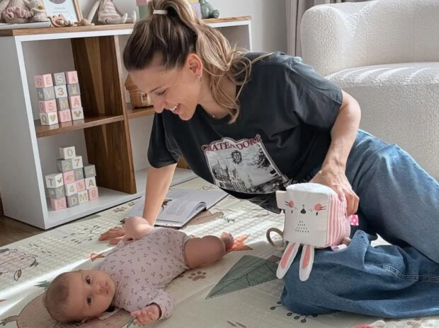 En la misma línea, momentos antes de posar sobre la cama, estuvo en brazos de su mamá, Macarena, quien compartió también desde sus redes otra imagen en la que se ve a su hija sentada sobre ella y escribió también reflexiva como el padre: "Tiempo... ¿podrás ir más despacio?", en una clara alusión a lo rápido que están pasando estos meses de crecimiento de la pequeña.