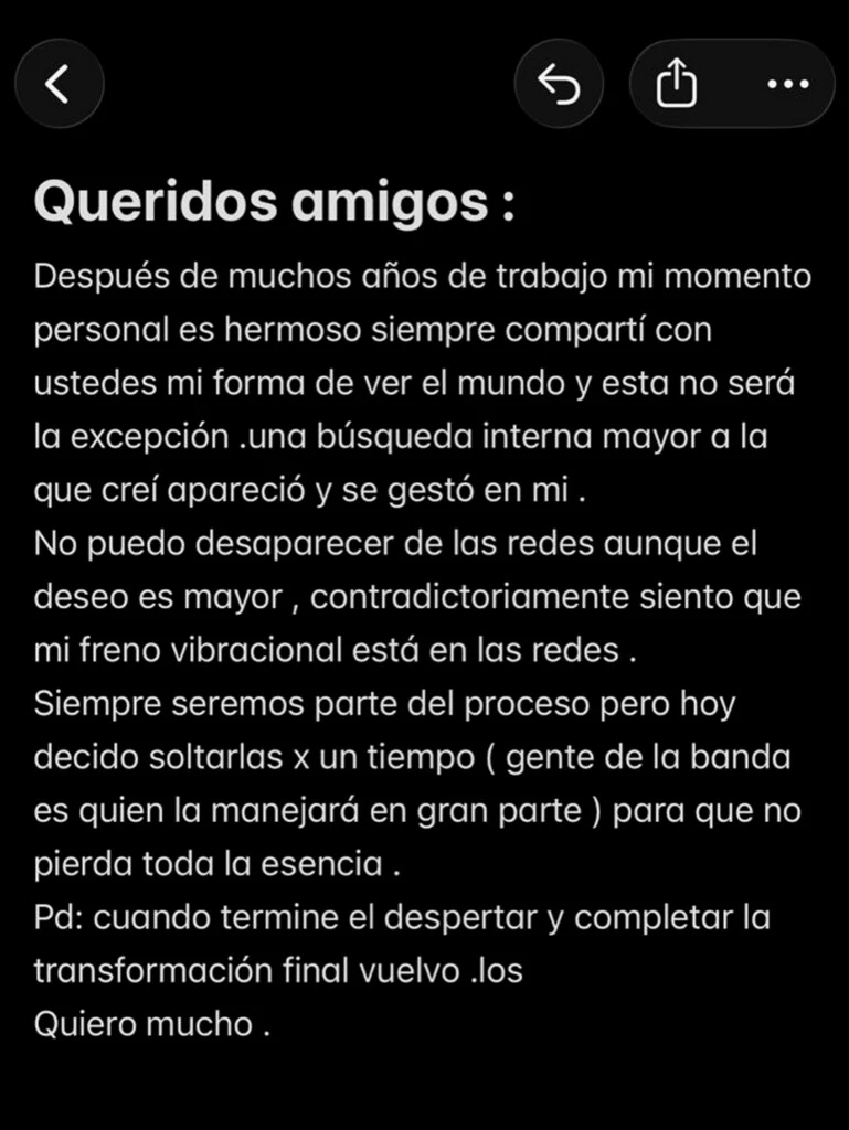 En ese contexto, aclaró cómo será el funcionamiento de sus cuentas durante este período. “Siempre seremos parte del proceso, pero hoy decido soltarlas por un tiempo (gente de la banda es quien la manejará en gran parte) para que no pierda toda la esencia”, explicó.
