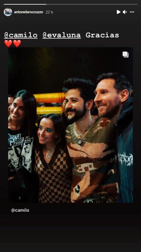 Por su parte, Antonela sólo subió a sus historias de Instagram una postal que compartió Evaluna, esposa de Camilo e hija de Ricardo Montaner, agradeciendo la presencia de ella y Messi en el show. "Gracias", escribió la esposa del astro del fútbol junto a un emoji de corazón.