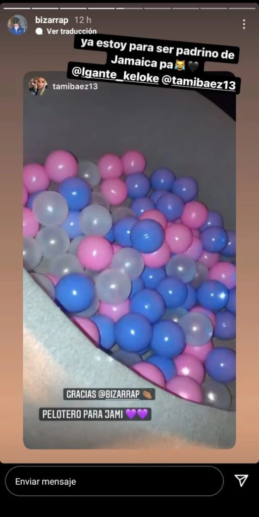 "Ya estoy para ser padrino de Jamaica pa", escribió el joven productor en sus historias de Instagram y mostró su llamativo regalo: un mini pelotero para bebés didáctico.