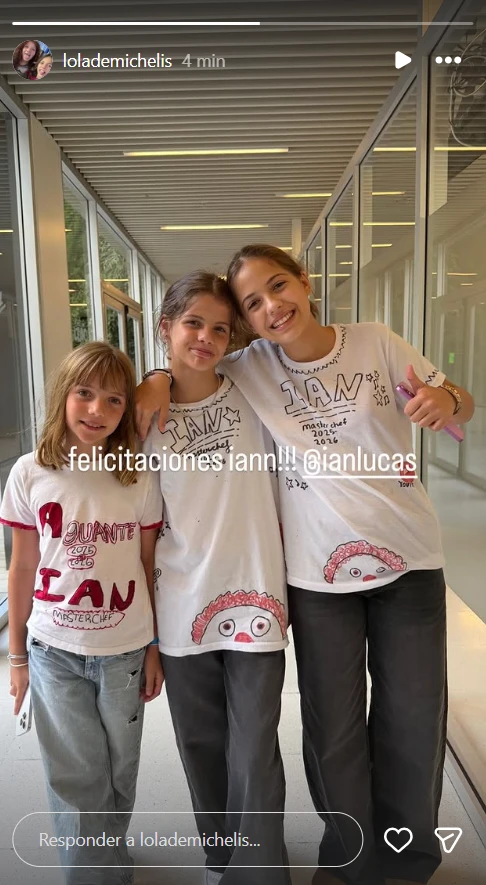 "Felicitaciones Ian!!!", expresó la nepo baby junto a Francesca e Isabella Icardi, quienes retrataron su apoyo con unas remeras blancas que intervinieron artesanalmente con frases: "Aguante Ian Lucas" o "Ian MasterChef 2025-2026".