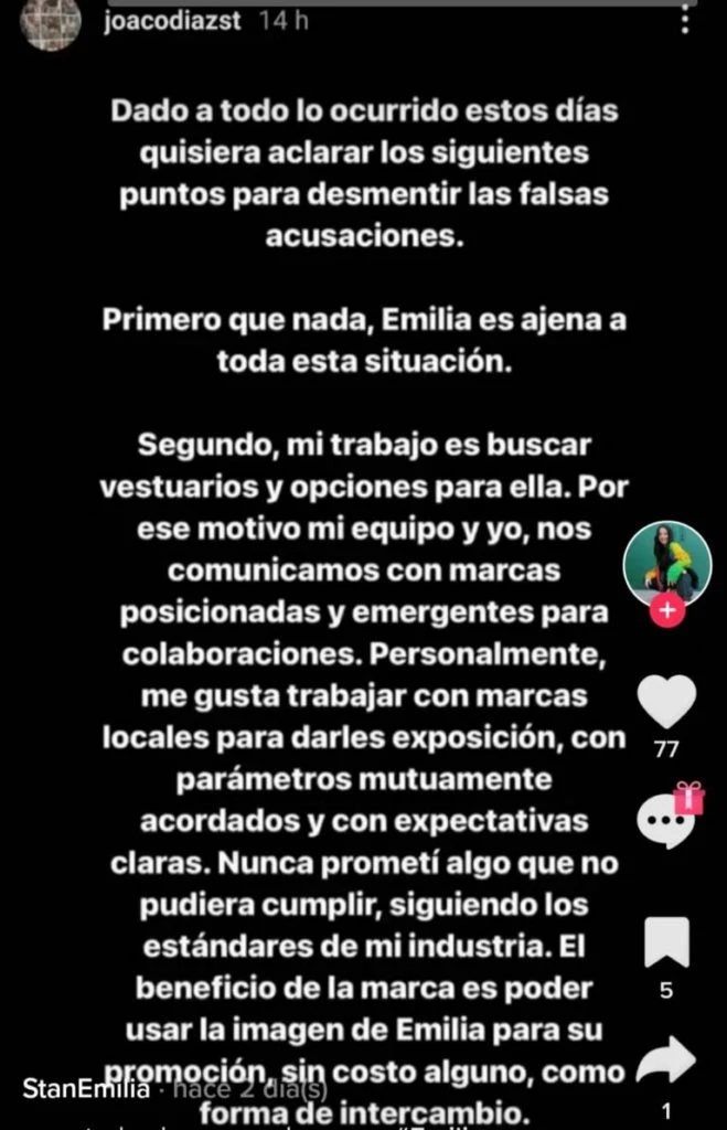 “El beneficio de la marca es poder usar la imagen de Emilia para su promoción, sin costo alguno, como forma de intercambio. Nunca prometí nada que no pueda cumplir” afirmó. Y continuó: “Me duele inmensamente ver que mi buena intención se manipulada para el beneficio de otros a cuestas del buen nombre de Emilia”, dijo sumando capturas de pantalla en la que muchos emprendedores en vez de mostrarse enojados le agradecian por la visibilización de sus productos.