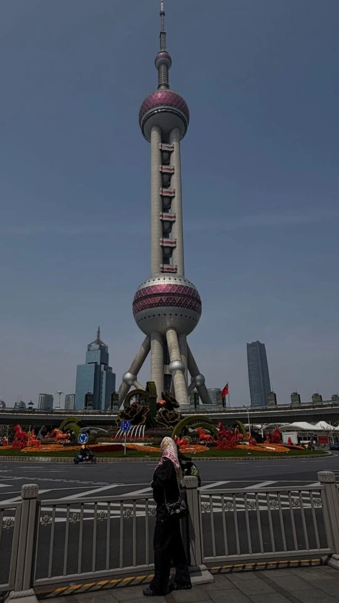 Uno de los grandes protagonistas de sus postales fue la Torre de la Perla Oriental, ícono de la ciudad y símbolo de su transformación constante. De día, imponente entre faroles rojos y avenidas infinitas; de noche, rodeada de un skyline que compite con las estrellas.