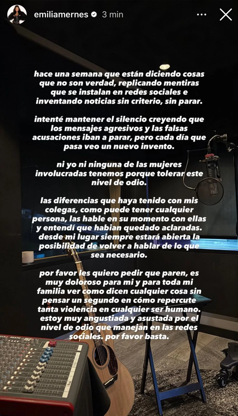 Todo comenzó a partir de versiones cruzadas y rumores sobre supuestos conflictos entre las artistas, que rápidamente escalaron en redes sociales. Aunque ninguna de las involucradas había hablado hasta ahora en profundidad, el volumen de comentarios, especulaciones y mensajes agresivos llevó a Emilia a expresarse a través de sus historias de Instagram con un contundente descargo.