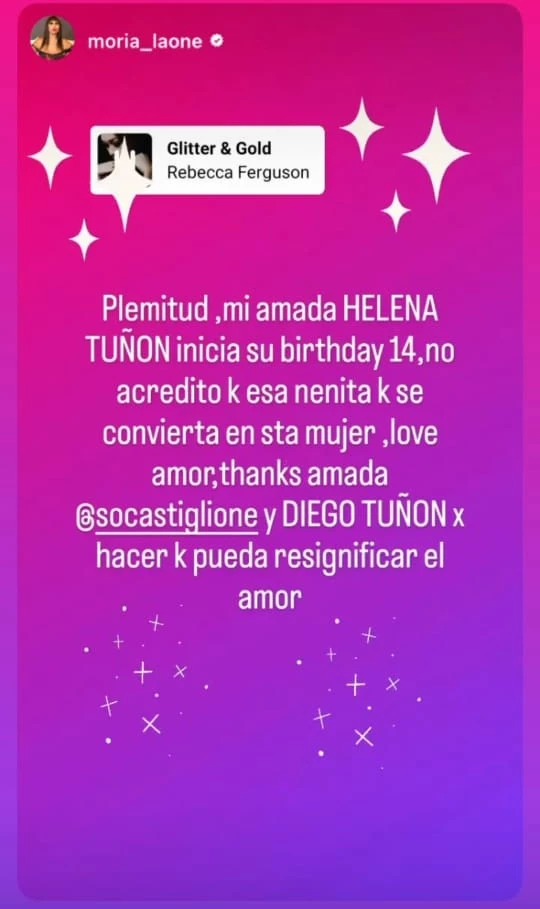 Moria también utilizó las redes sociales para dedicarle unas palabras a su nieta mayor: "Plenitud. Mi amada Helena Tuñón inicia su birthday 14. No acredito que esa nenita se convierta en esta mujer. Thanks amada Sofía Castiglione y Diego Tuñón por hacer que pueda resignificar el amor".