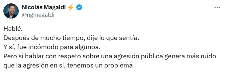 En su declaración, Magaldi señaló que "después de mucho tiempo", dijo lo que sentía. Y reconoció que "fue incómodo para algunos", pero afirmó que "si hablar con respeto sobre una agresión pública genera más ruido que la agresión en sí, existe un problema".