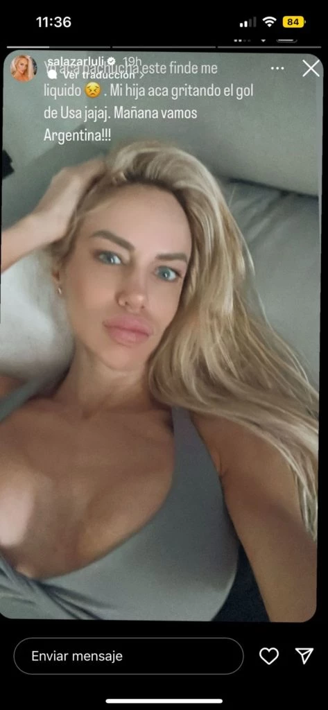 "Yo acá pachucha, este finde me liquidó. Mi hija acá gritando el gol de USA. Vamos Argentina mañana", escribió la modelo en sus redes sociales en la previa al partido del equipo de Lionel Scaloni contra Arabia Saudita.