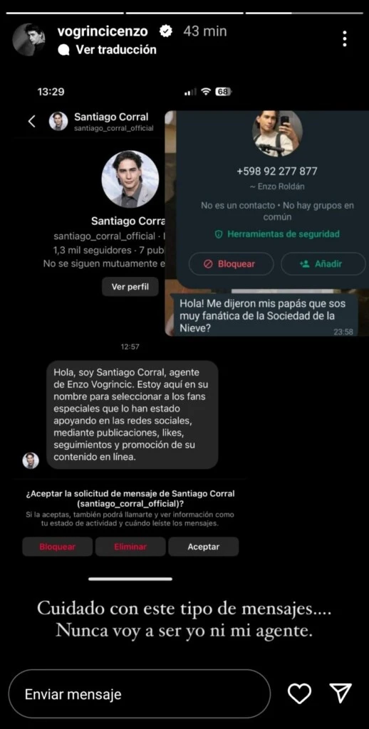 “Hola, soy Santiago Corral, agente de Enzo Vogrincic. Estoy aquí en su nombre para seleccionar a los fans especiales que lo han estado apoyando en sus redes sociales, mediante publicaciones, likes, seguimientos y promoción de sus contenidos en línea”, indicaba uno de los mensajes que enviaban los estafadores usando su imagen como pantalla.