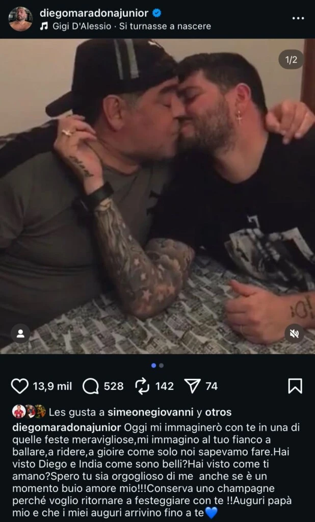 Desde Italia, Diego Junior Maradona publicó un mensaje lleno de añoranza: “Hoy me imaginaré con vos en una de esas fiestas maravillosas. Me imagino a tu lado, bailando, riendo, disfrutando como solo nosotros sabíamos hacerlo".