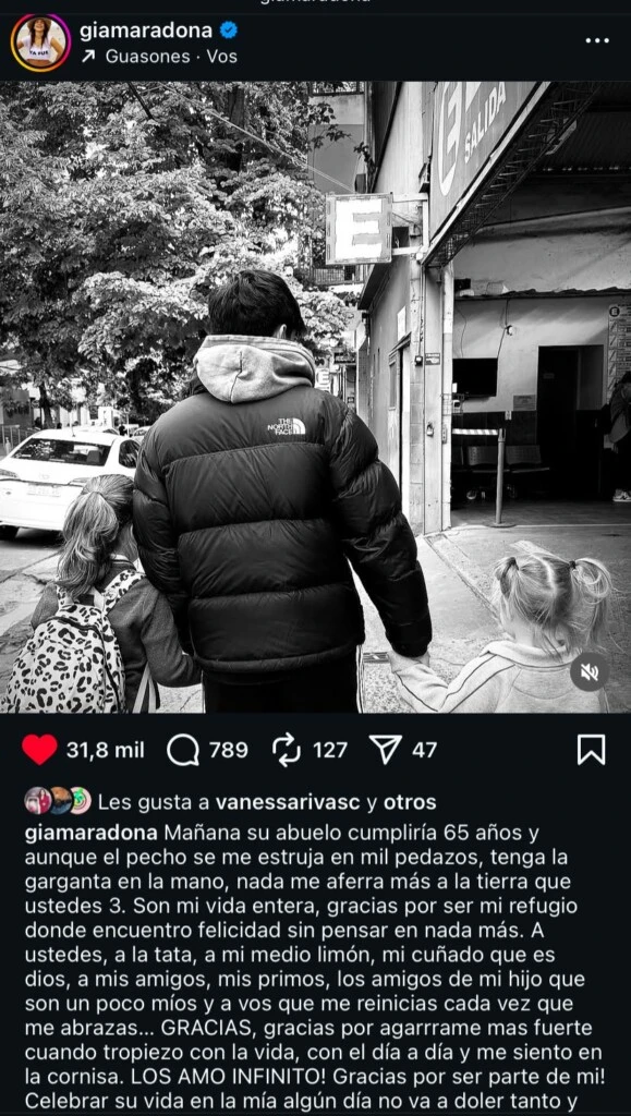 Entre los mensajes más conmovedores estuvo el de Gianinna Maradona, quien compartió una foto en la que se ve a su hijo Benjamín junto a sus sobrinas Azul y Roma de espaldas, mirando al horizonte.