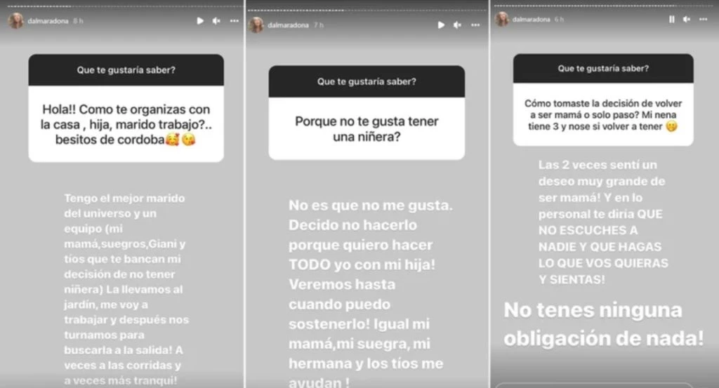 “¿Cómo te organizas con la casa, marido, y trabajo?”, indagó otra seguidora. “Tengo el mejor marido del universo y un equipo (mi mamá, suegros, Giani, y tíos que bancan mi decisión de no tener niñera. La llevamos al jardín, me voy a trabajar y después nos turnamos para buscarla a la salida, a veces a las corridas y a veces más tranqui”, aseveró.