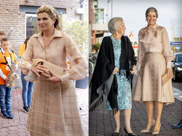 Ayer, Máxima volvió a repetir outfit cuando visitó la empresa de metal Veluw Metal Creations (VMC) en Nieuwkuijk. Allí recorrió la fábrica y se interiorizó sobre el sector del metal. El rosa empolvado por el que optó es un conjunto que ya se le vio en otra oportunidad pero recicló con stilettos en color suela y una pequeña cartera de estilo canasta.
