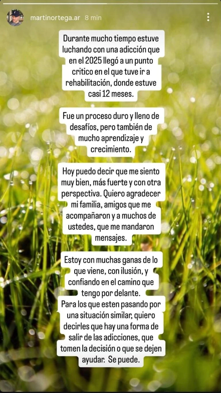Hoy, con otra perspectiva, Martín Ortega se muestra fortalecido. “Puedo decir que me siento muy bien, más fuerte y con otra perspectiva”, aseguró. Y agregó: “Quiero agradecer a mi familia, amigos que me acompañaron y a muchos de ustedes, que me mandaron mensajes”.