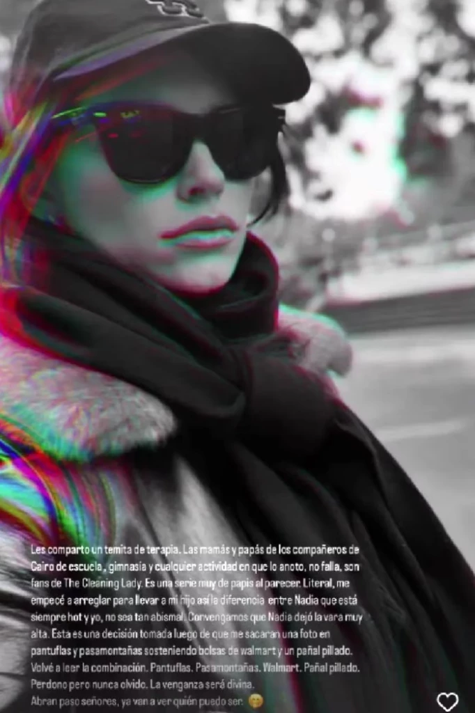 "Literal me empecé a arreglar para llevar a mi hijo así la diferencia entre Nadia que está siempre hoy y yo no sea tan abismal. Convengamos que Nadia dejó la vara muy alta. Esta es una decisión tomada luego de que me sacaron una foto en pantuflas y pasamontañas sosteniendo bolsas de Waltar y un pañal pillado. La venganza será divina", cerró