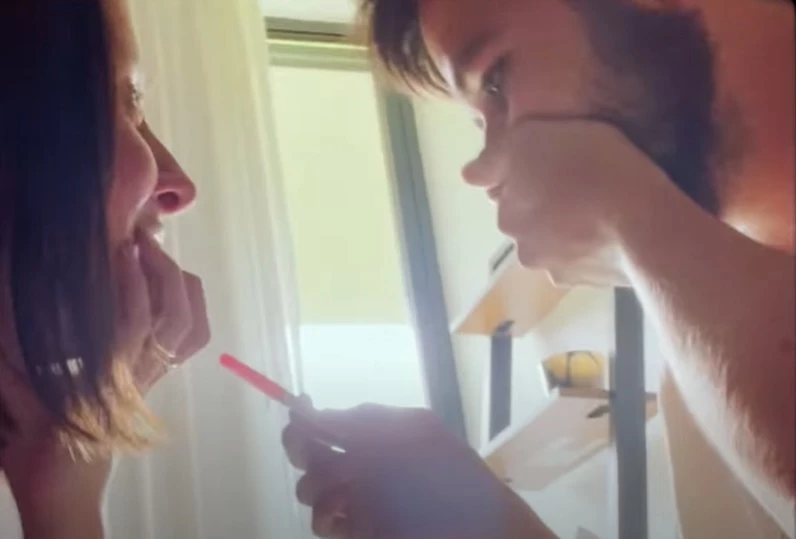 Luego, se muestra la escena del baño junto al test de embarazo positivo. Un resultado que despierta lágrimas y emoción en la pareja que se abraza al saber que tendrán a su primer bebé.