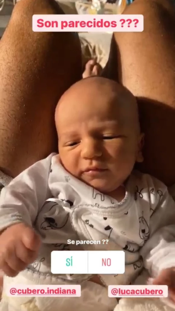 En las fotos se ve a la mayor de las chicas posando con un filtro que le quita el cabello y al bebé durmiendo sobre las piernas de su papá, Cubero escribió: "¿Son parecidos? Luca, ¿sos parecido a Indi? ¡Sos igual!".