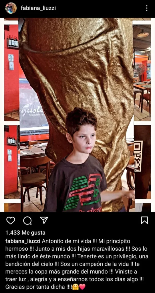 "Te merecés la copa más grande del mundo! ¡Viniste a traer luz, alegría y a enseñarnos todos los días algo! Gracias por tanta dicha”, cerró Fabiana Liuzzi el mensaje. Pocos minutos después, empezaron a llegarle cientos de mensajes de apoyo y felicitaciones por el rol de madre que cumple con Antoñito.