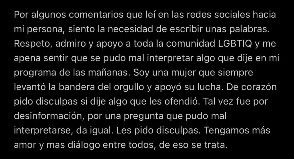 Por último aseguró, “Mi vieja doy fe del amor que tiene y el apoyo a la comunidad que realmente ha dado. Pero cuando una persona se equivoca y dice ‘los’ en vez de ‘las’ no es una ofensa, entiendan que puede uno equivocarse”.