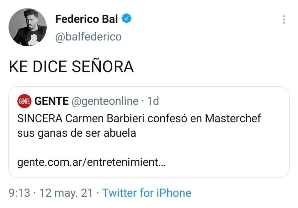 Luego de leer la nota de GENTE donde la capocómica manifiesta sus ganas de tener un nieto, el actor replicó la noticia en Twitter. "¿¡Qué dice señora?!", se preguntó irónico ante los dichos de su madre. Una reacción con la que demostró que por el momento la paternidad no está entre sus planes.