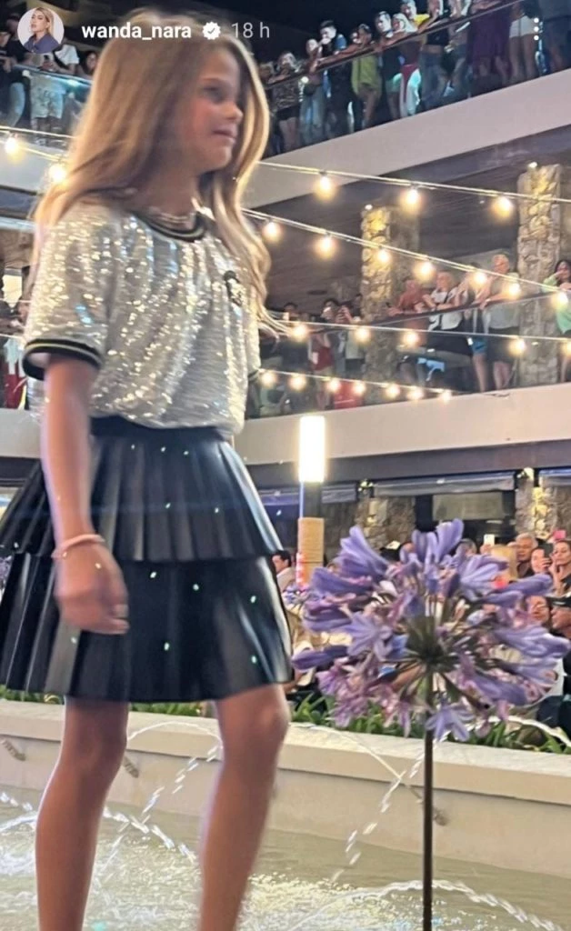 La hija mayor de Mauro Icardi estrenó su paso por las pasarelas en un shopping de Punta del Este en un evetno conducido por Pampita y Wanda. Su primer outfit fue un traje de baño floreado, collar de caracoles y balerinas doradas.