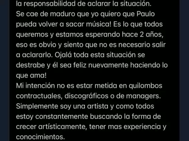 En su mensaje, que muchos consideraron "tibio", Becerra explicó: "Mi intención no es estar metida en quilombos contractuales, discográficos o de managers. Simplemente soy una artista y como todos estoy constantemente buscando la forma de crecer artísticamente, tener más experiencia y conocimientos".