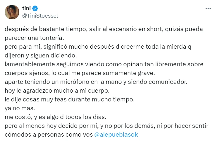 Lo cierto es que esos comentarios llegaron a Tini y lejos de llamarse a silencio, ella le respondió a Pueblas con un contundente mensaje que subió a su cuenta de X (ex Twitter).