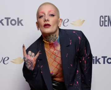 El toque final lo dieron unas botas negras con plataforma y caña alta, de estética industrial, que reforzaban el carácter combativo del look. El make up fue dramático, con sombra fucsia, cejas marcadas y labios oscuros, mientras que la cabeza completamente rapada aportaba una fuerza escénica que pocas figuras en el espectáculo argentino logran sostener con tanta naturalidad. Todo el estilismo pareció construido en torno a un único eje: no encajar, no suavizar, no pedir permiso