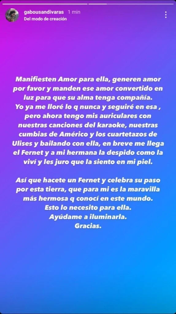 "Cada une tiene su fe, su creencia y sobre todo amor, amor por mí, amor por ella y son fuentes de amor. Les pido que prendan una vela, sahumerio, rezos o lo q cada une desee y pidan por la luz en el camino del alma de mi hermana", continuó con su especial pedido.